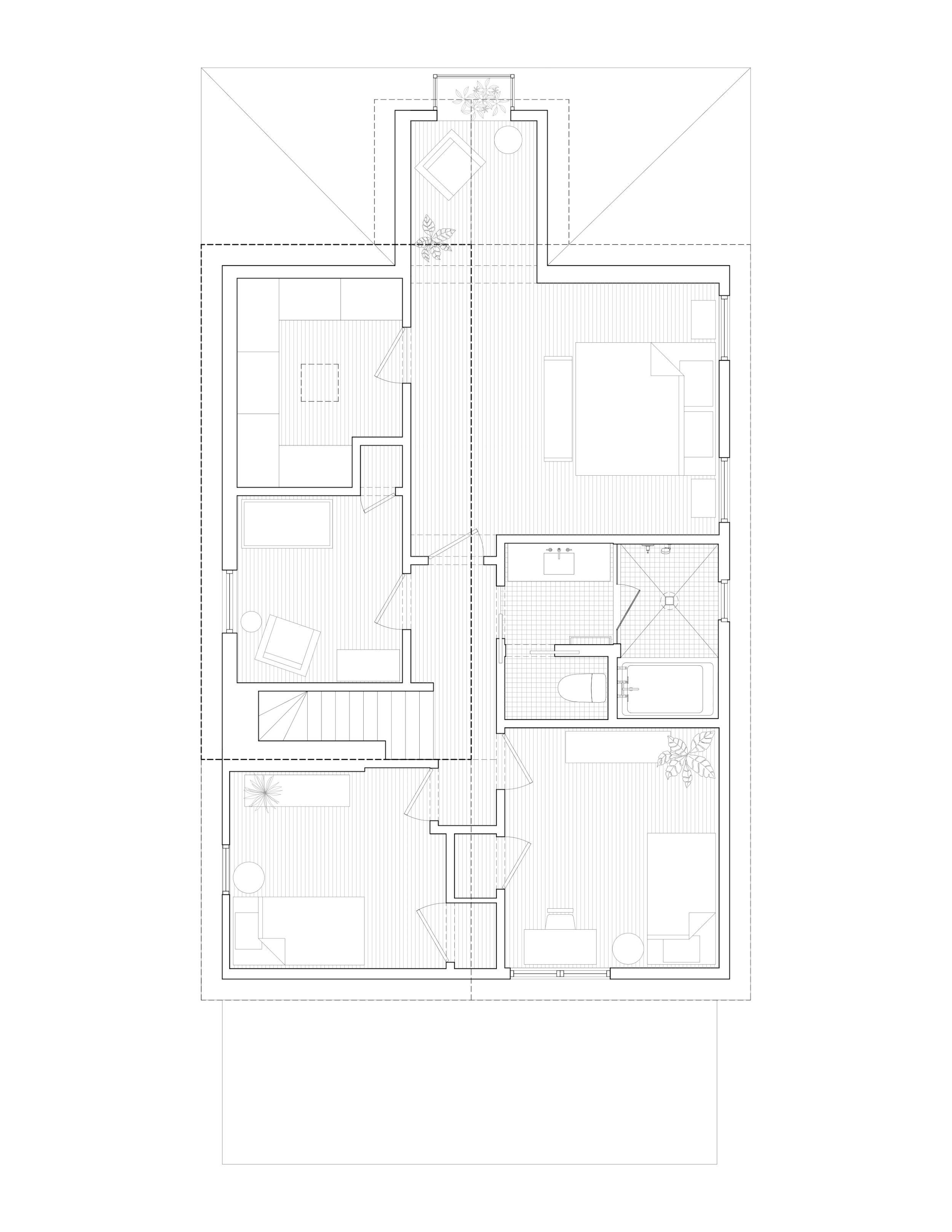 Phase Two dormered the last remaining portion of the original roof. The dormer granted us enough head height to add a small nursery and a sizeable walk-in closet serving the primary bedroom. This snug upper level now accommodates four bedrooms, functional storage, and one large, shared bath within the existing footprint.