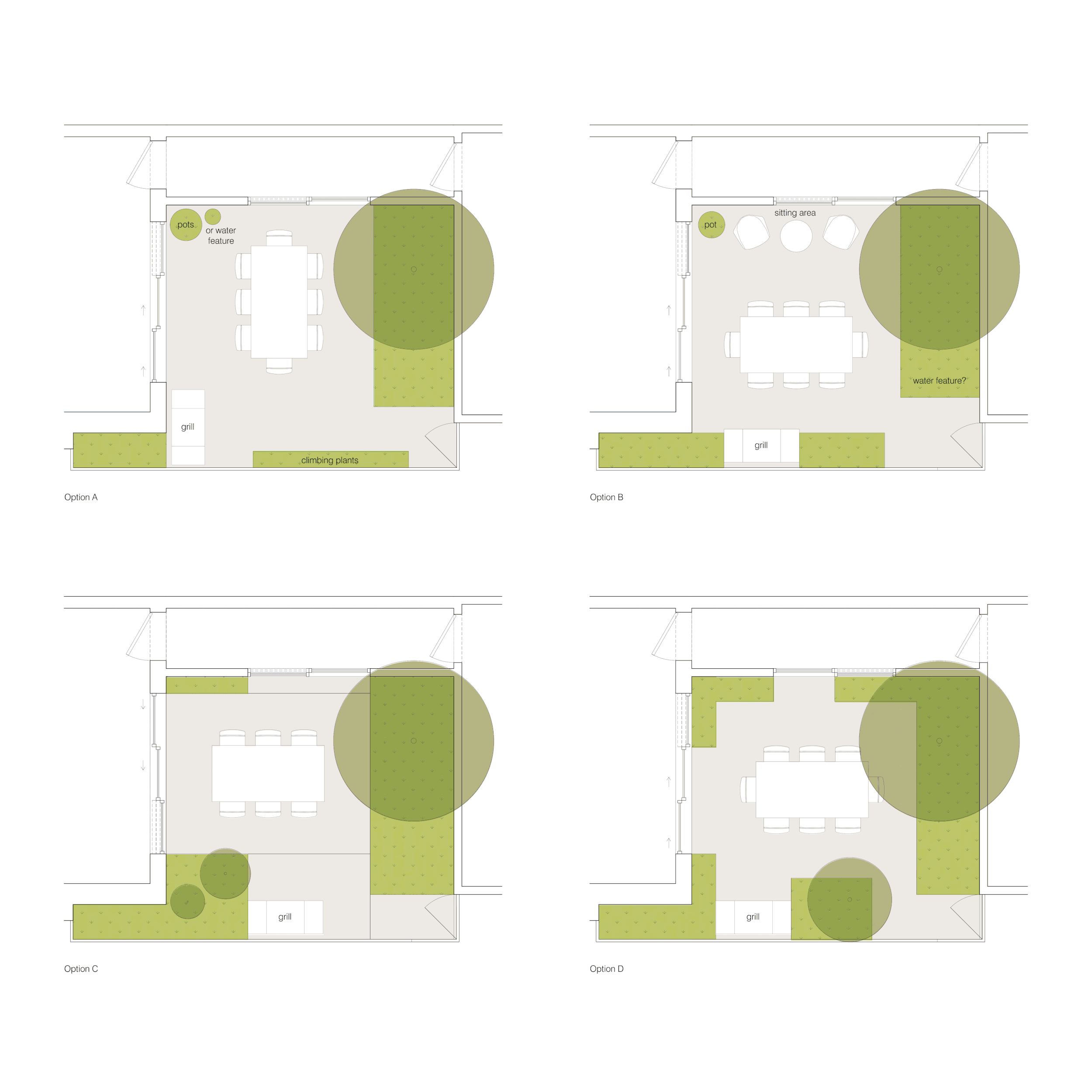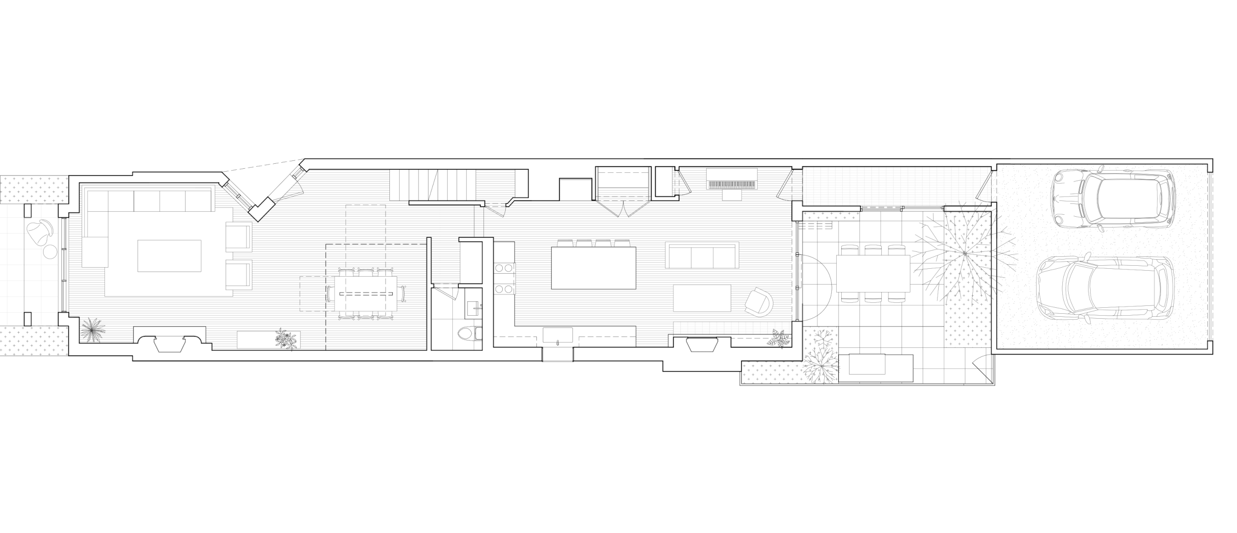 We considered every square inch of the small courtyard while balancing hardscape and softscape to provide both visual softness and programmatic functionality. Glass bifold glass doors to create an indoor/outdoor connection between the family room and courtyard.