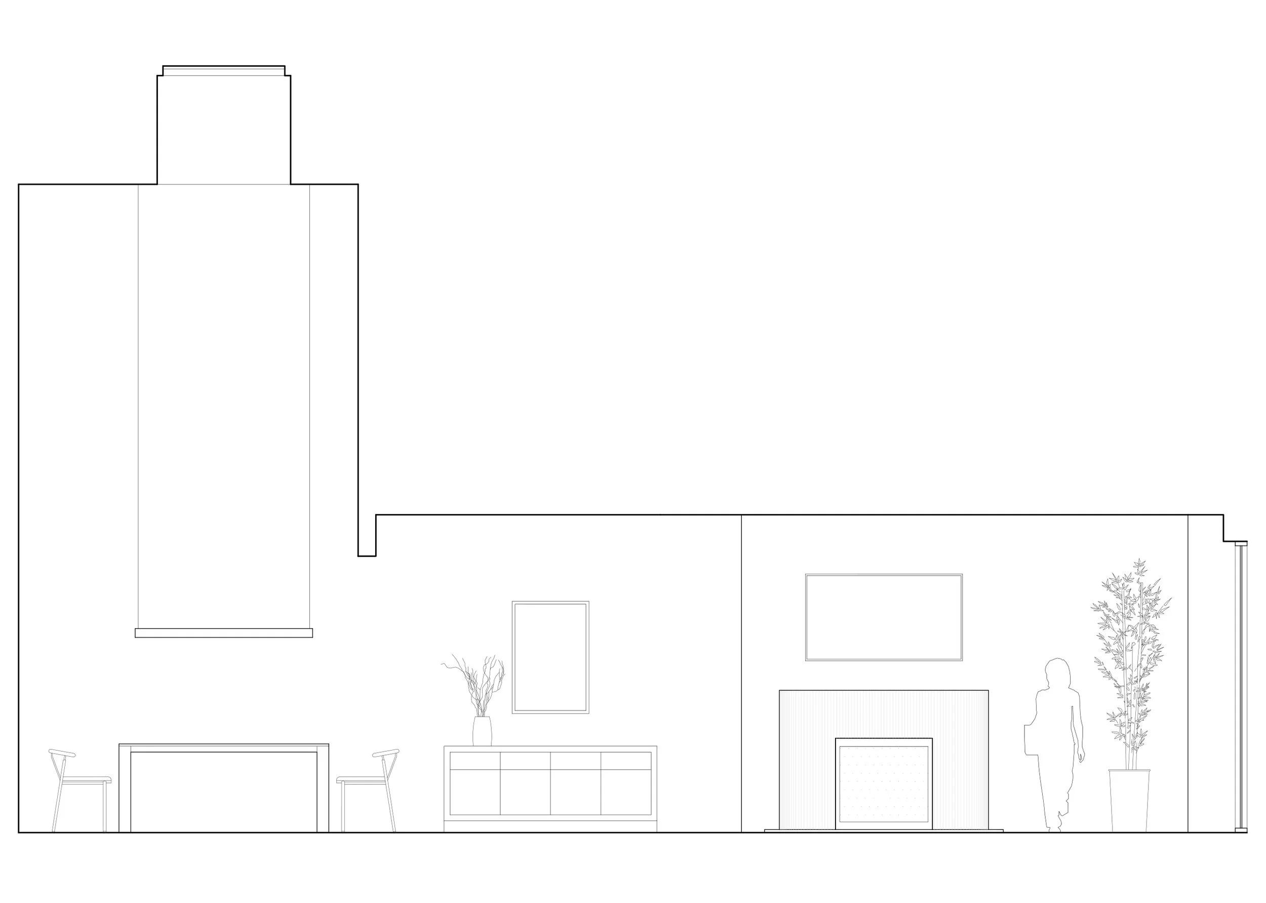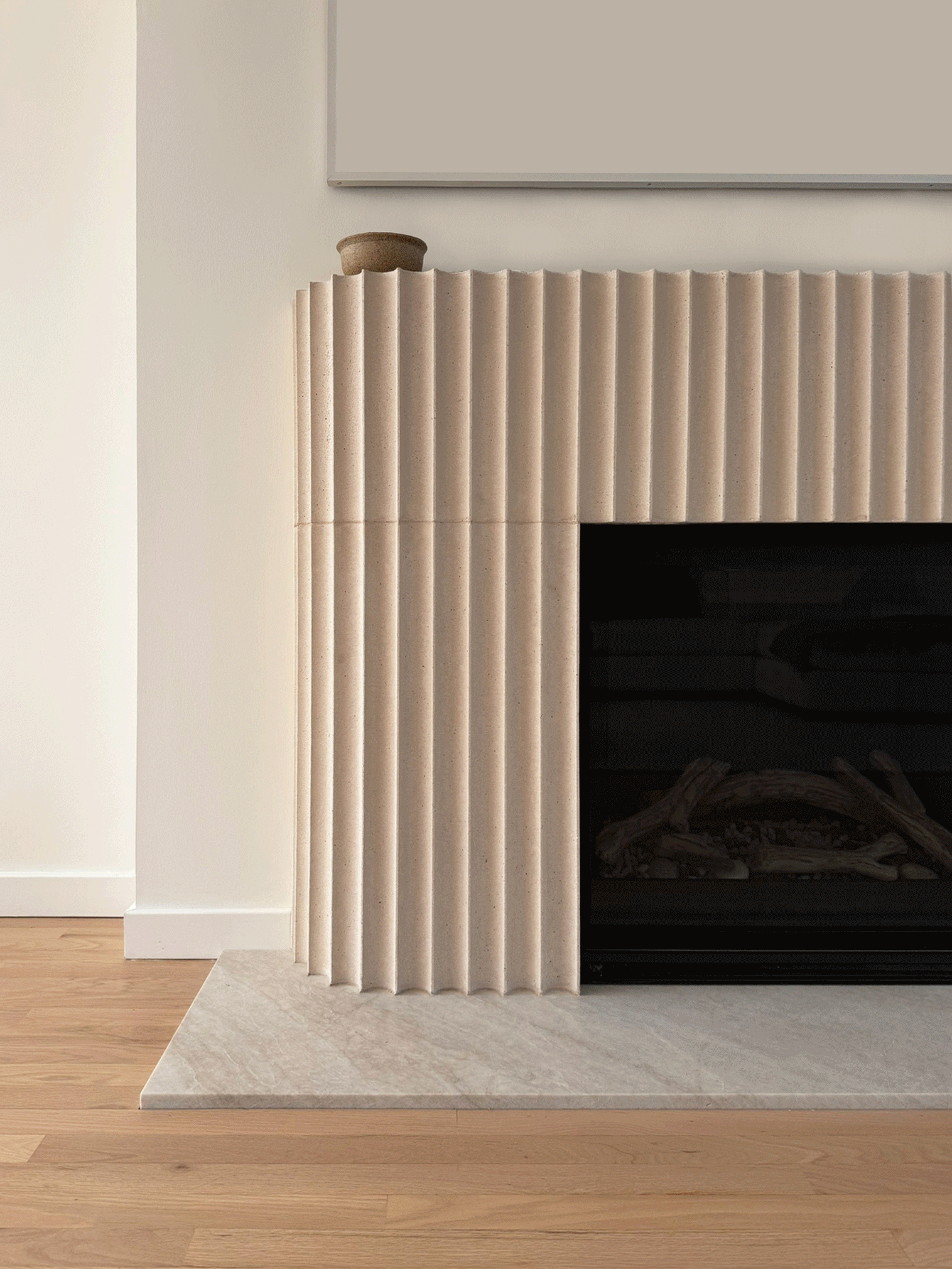 We focused our attention on designing particular moments to anchor the open floor plan. In the living room, we designed a custom fluted cast fireplace surround with a honed quartzite hearth. The flutes’ shadow lines and hearth’s veining give the eye a place to rest along the long painted wall and expansive refinished oak floors. The retrofitted gas fireplace provides a warm, cozy gathering place.