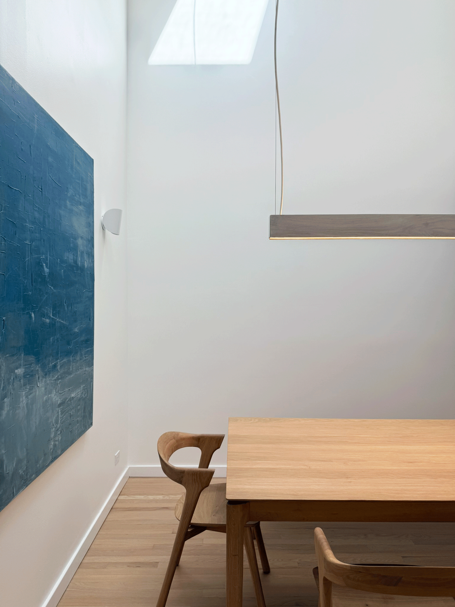 The double-height dining room already had an impressive volume and natural light from the skylight overhead. Our goal was to enhance the spatial volume, bounce light further into the space, and update the aesthetic. We replaced the front door, removed the interior glass block windows, replaced the foyer tile with hardwood, refinished the floors, replaced the stairs, lightened up the walls, and swapped out light fixtures. We selected natural finishes, well-crafted furniture, a custom pendant, and playful sconces to help create a light and airy feel.