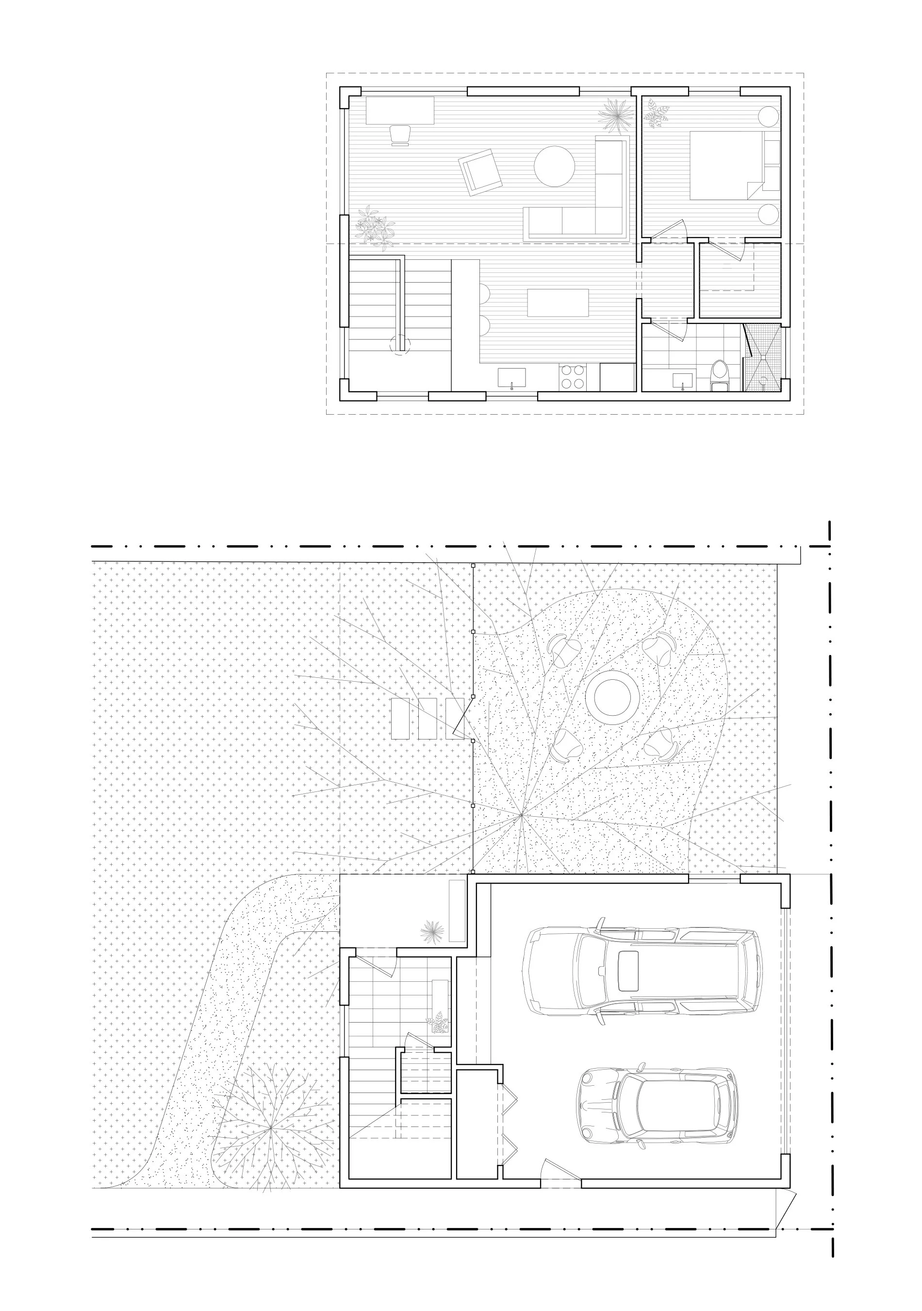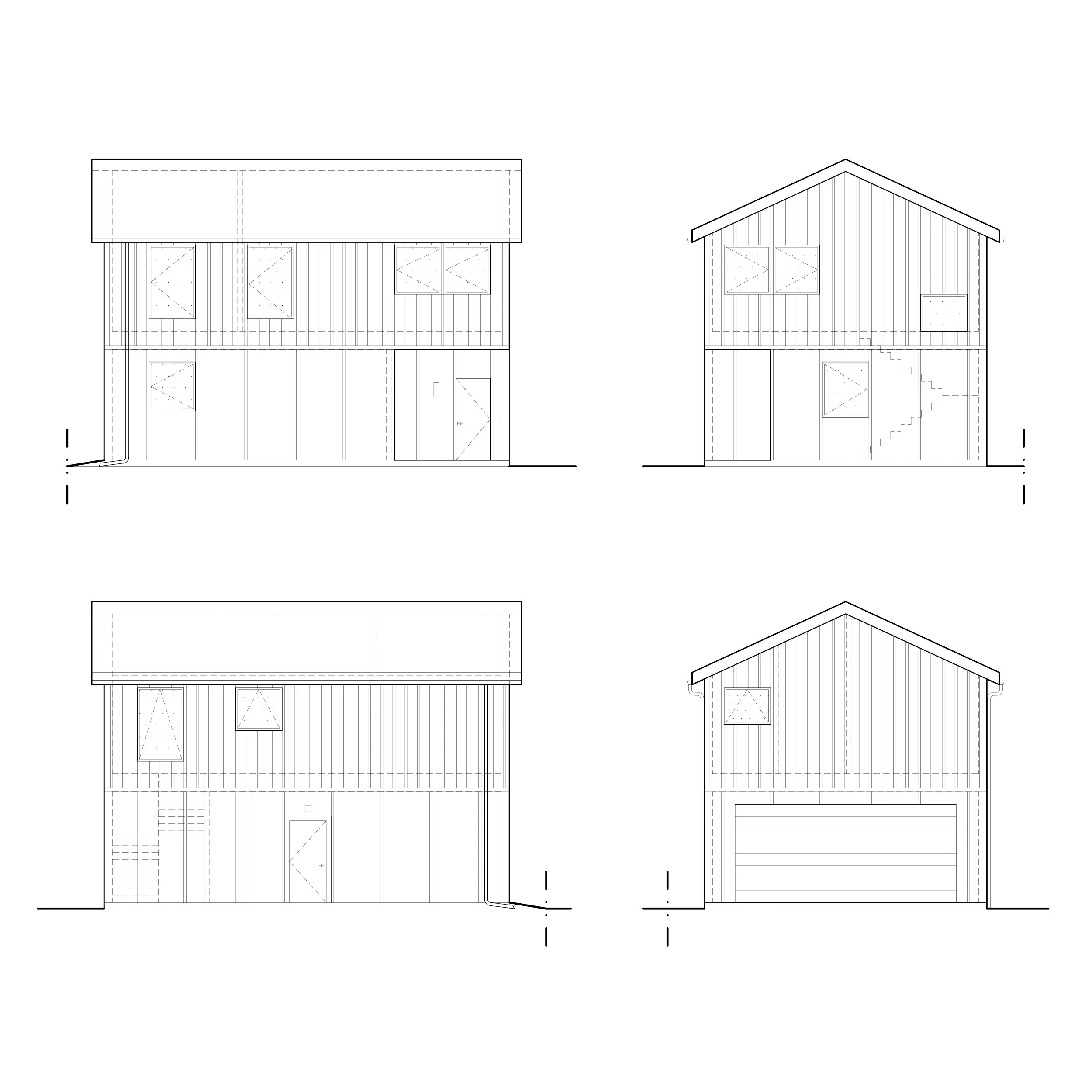 Outpost proposed leaving the main house as is, while replacing the existing one-story, two-car garage with a two-story detached ADU. The new structure would feature a one bed, one bath dwelling unit above a garage and workshop. In the short term, it would serve as a dedicated workspace separate from the client’s day-to-day family life. It would also act as a guest house for their visitors’ extended stays. In the long term, it would provide a rentable unit adding housing to the neighborhood and offsetting the clients’ mortgage.