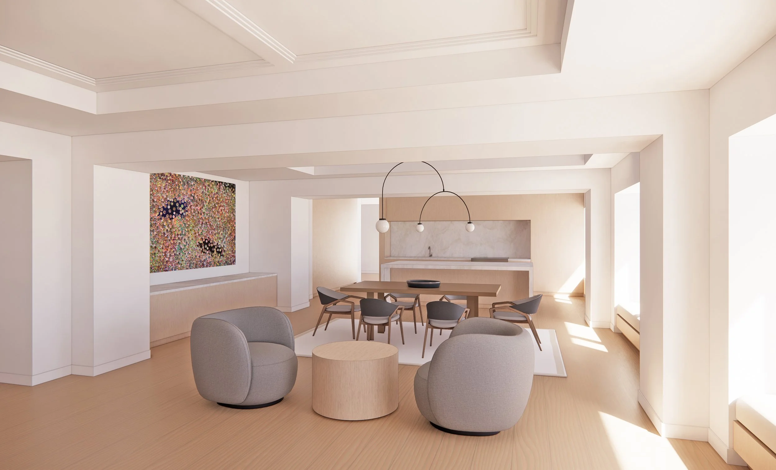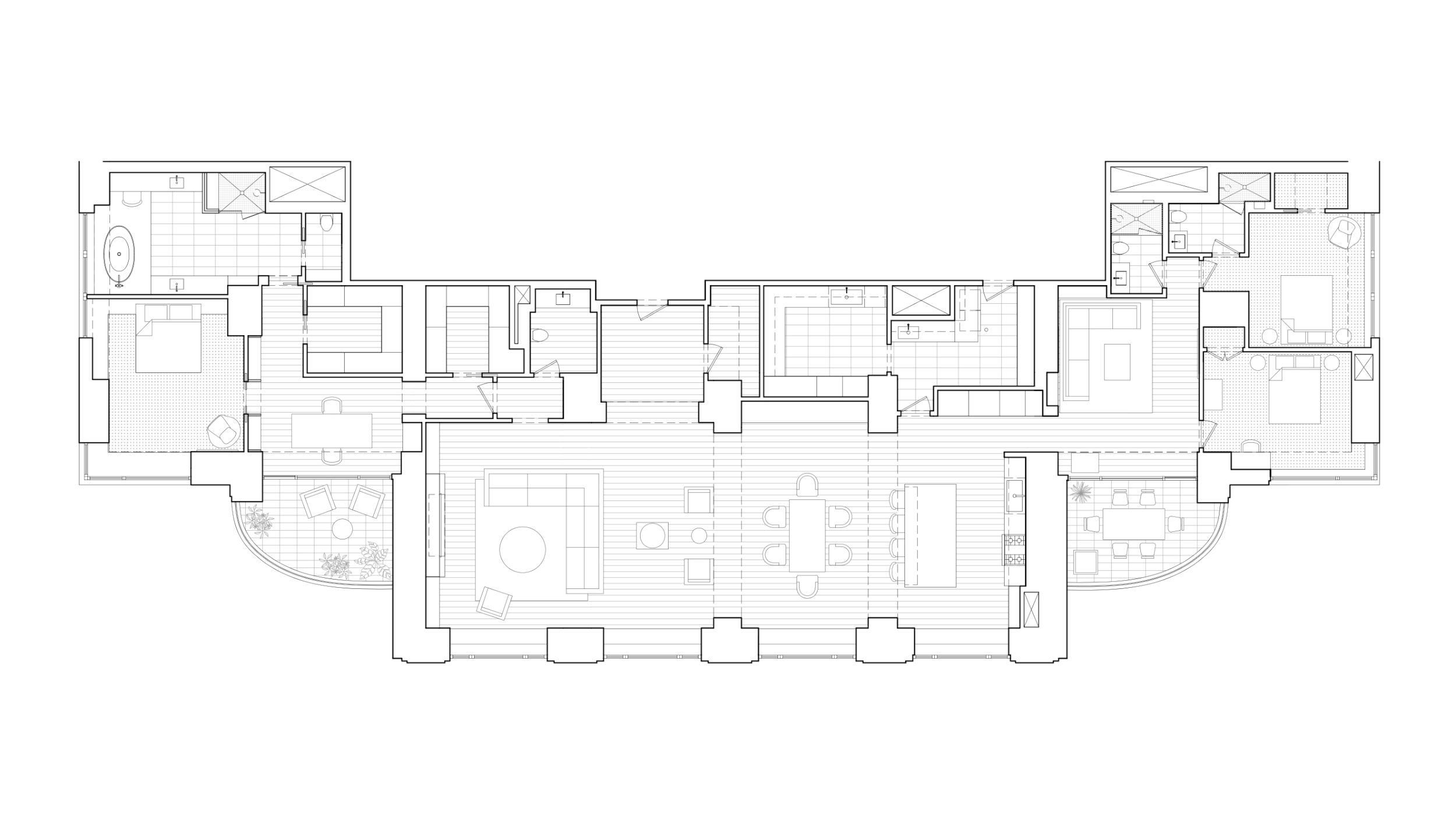 To the south, a primary suite includes a study, terrace, bedroom, walk-in closets, and bath. Built-in millwork enhances storage and comfort where freestanding furniture would compromise flow and function.